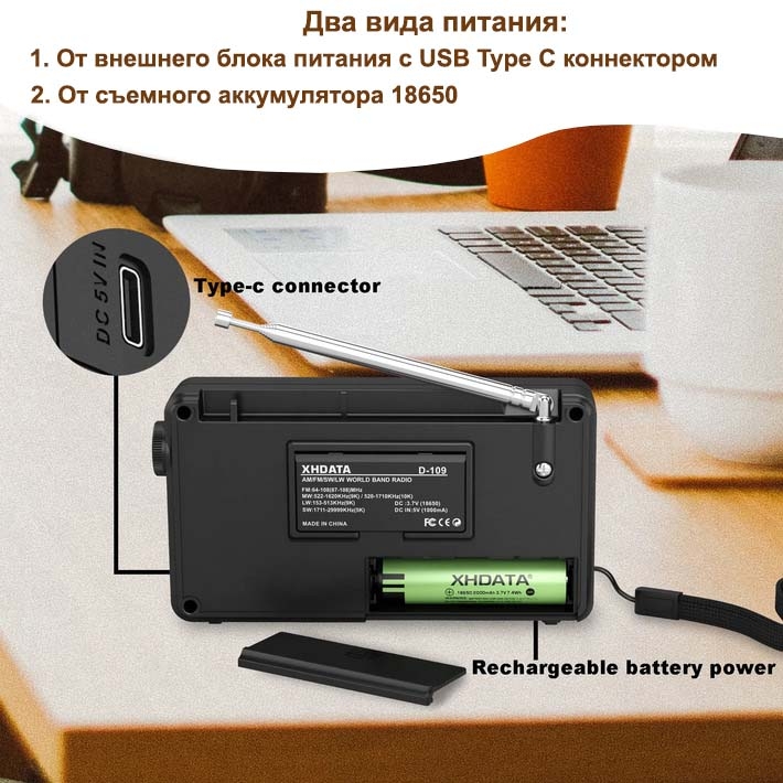 • Питание от аккумулятора 18650, встроенная зарядка