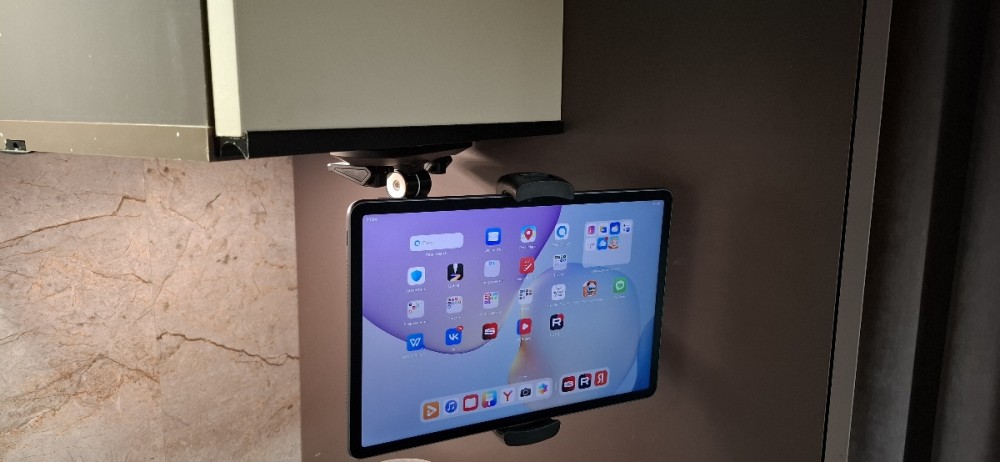 Держатель планшета/смартфона имеет раздвижной зажим. Он совместим с устройствами, размер которых находится в пределах 140-215 мм и вес до 500 грамм.