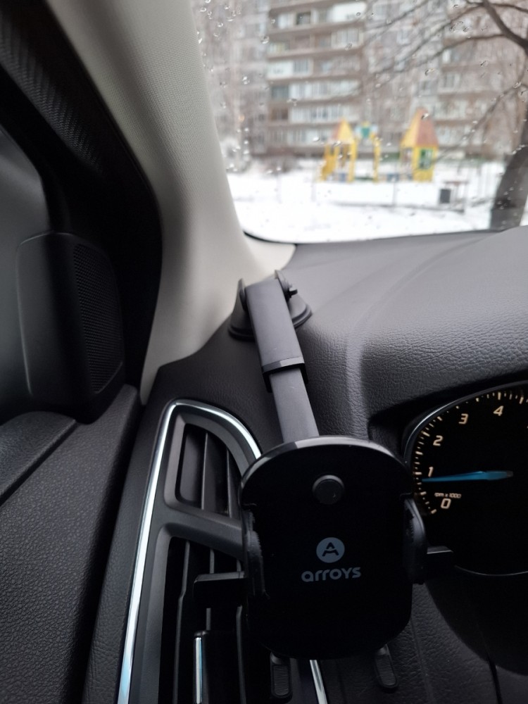 Автомобильный держатель Arroys Dash-MT2 крепится на лобовое стекло или приборную панель с помощью вакуумной присоски диаметром примерно 65 мм. Зажим смартфона автоматический. При установке в держатель корпус смартфона нажимает на кнопку и зажим закрывается автоматически. Для извлечения смартфона из держателя необходимо нажать кнопки сбоку. Все это делается очень удобно одной рукой. Если экран девайса широкий, то надо на кнопки надеть удлинительные колпачки. Держатель совместим со смартфонами с экраном шириной от 55 до 95. мм.