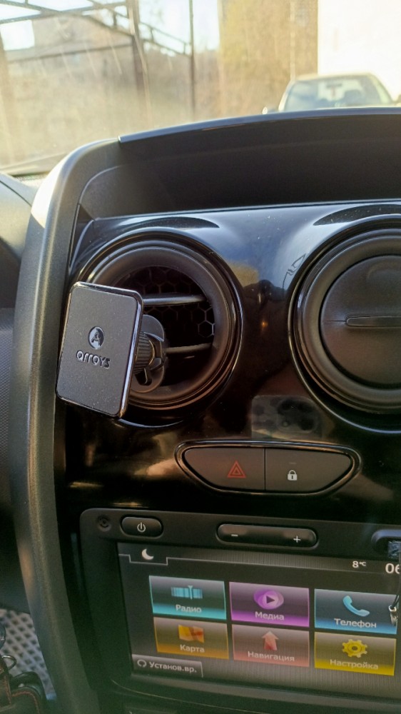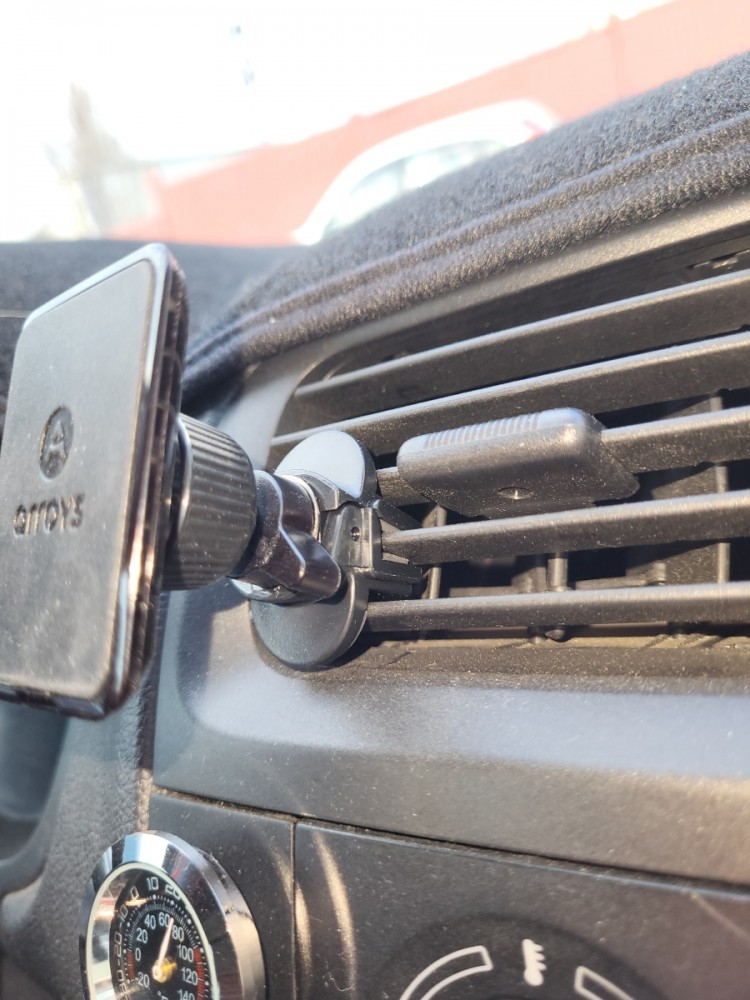 Само крепление на вентиляционную решетку - достаточно удобный способ, позволяющий разместить смартфон под рукой и с хорошим визуальным обзором. Чтобы горячий воздух из дефлектора не повредил смартфон, заслонку этой секции, как правило, перекрывают. Держатель устанавливается на вторую снизу лопасть решетки. При этом, он должен быть вставлен внутрь до конца, чтобы антивибрационная пластина уперлась в дефлектор. С помощью вращающегося "барашка" затягивается зажим крепления держателя в воздуховоде. В отличие от дешевых вариантов держателей в вентиляцию, которые крепятся только на упругости пластика, Arroys Vent One держится очень надежно и не вибрирует при езде. Он точно не вынется из решетки сам по себе, когда вы захотите снять телефон с магнитной "головы".