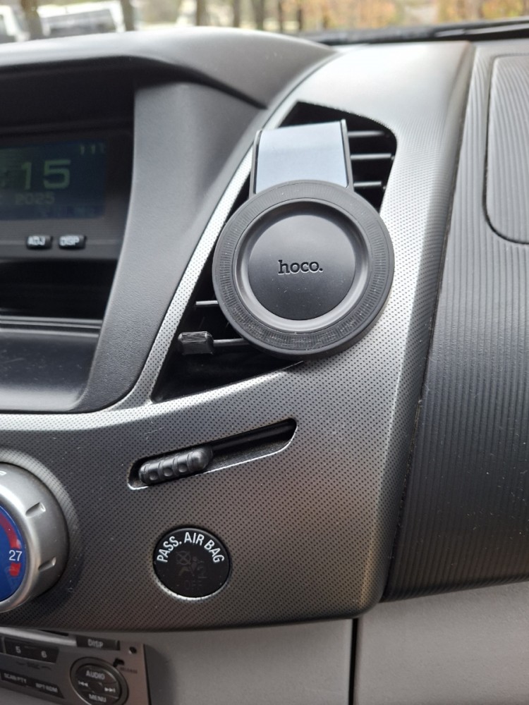 Автомобильный магнитный держатель телефона Hoco H56 из термостойкого пластика и с металлическим крюком надёжно фиксируется за пластину дефлектора. Аксессуар остаётся на месте и не теряет телефон на кочках, лежачих полицейских и поворотах