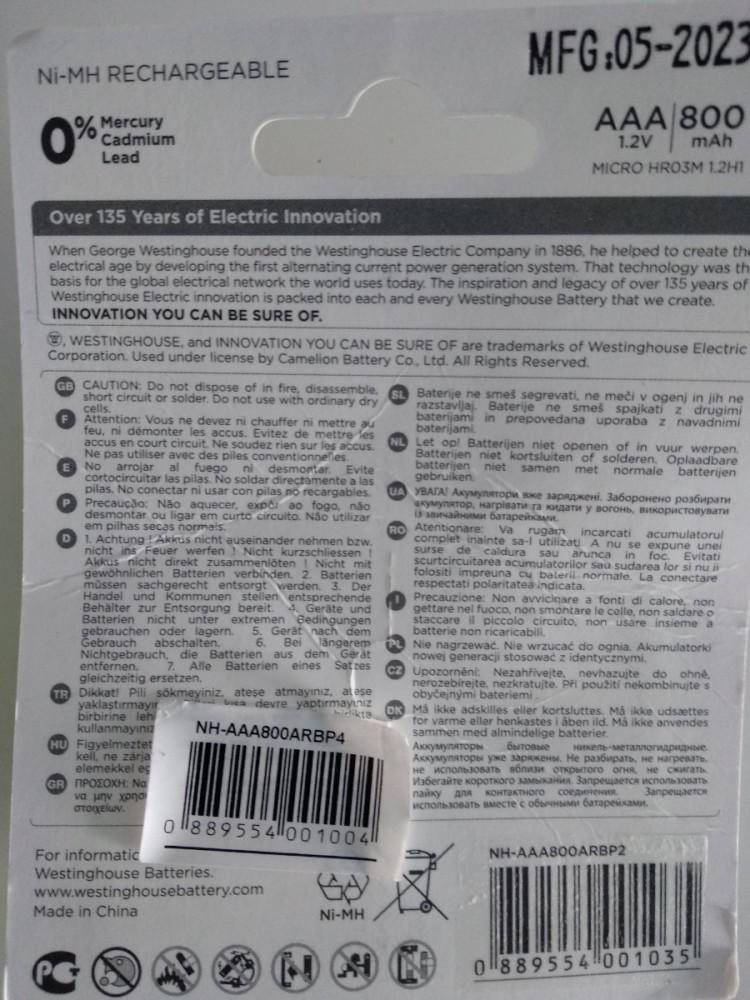 Никель-металлгидридные аккумуляторы ААА Westinghouse 800 mAh серии Premium служат специально для повседневных домашних нужд. Продаются предварительно заряженными солнечной энергией и готовыми к применению