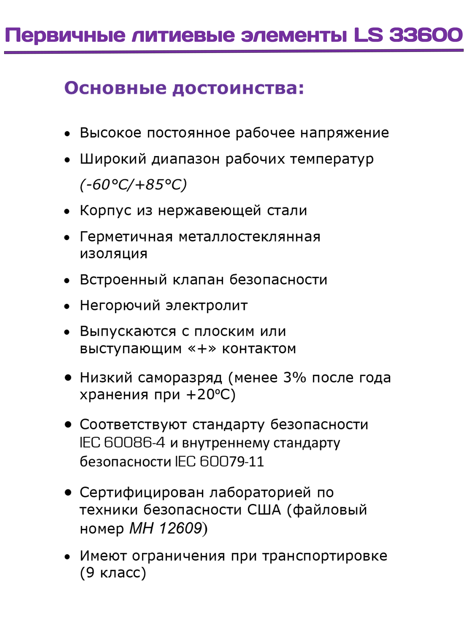 LS 33600 рекомендуется использовать для питания приборов с малыми токами разряда: автоматические приборы учета, буи, измерительное
